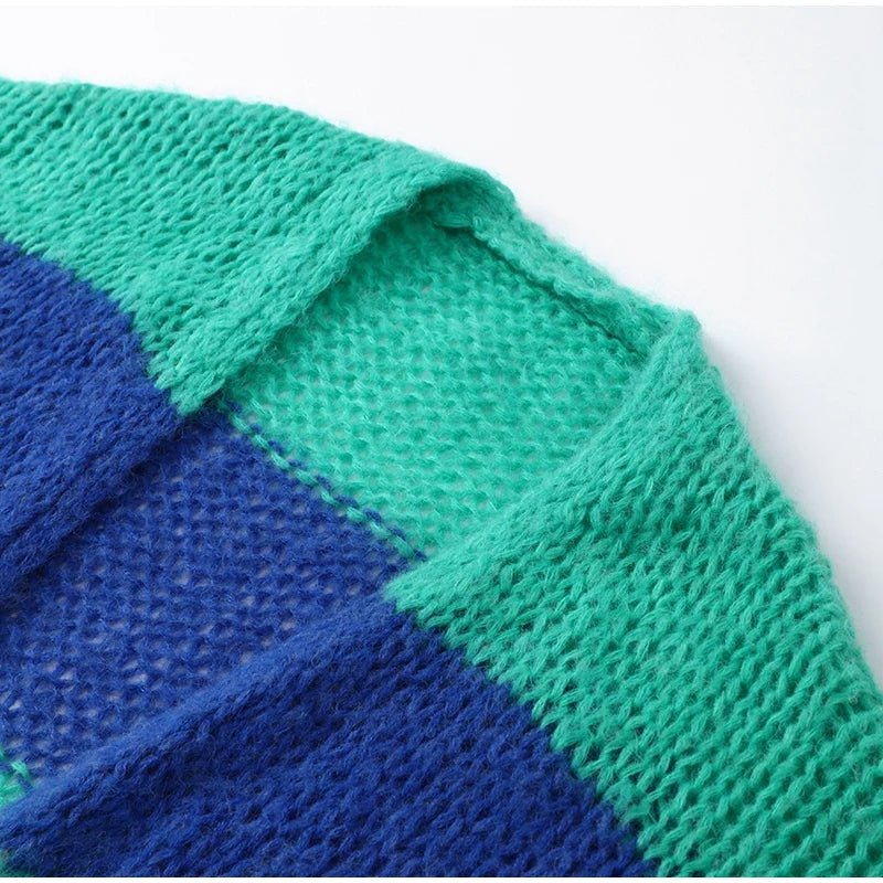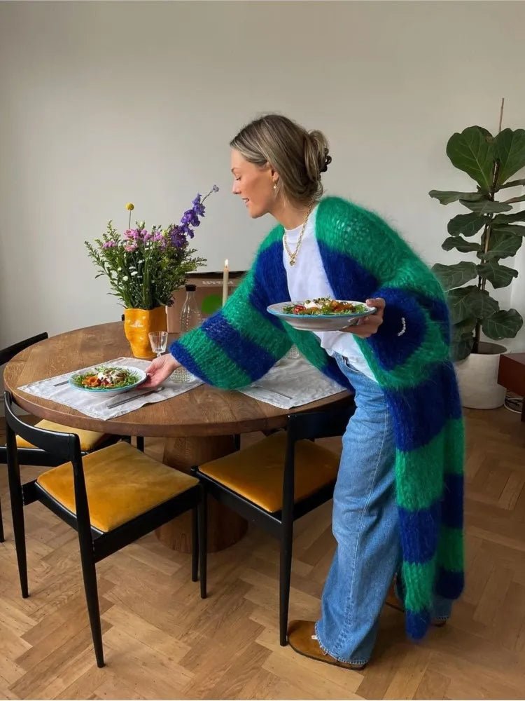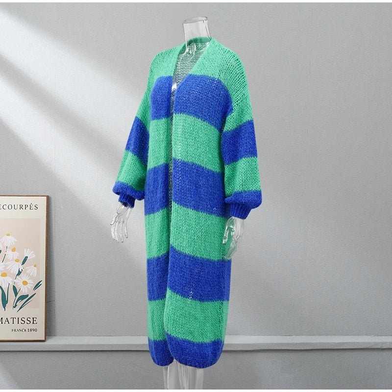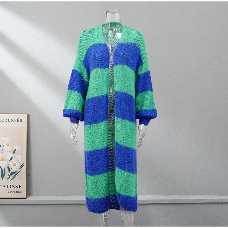 Confeccionado con líneas de colores verde y azul que se entrelazan como las olas del mar, este abrigo captura la esencia misma de la naturaleza en movimiento. Su largo diseño te envuelve en una sensación de calma y tranquilidad, mientras que su tejido suave y ligero te ofrece comodidad y libertad de movimiento.