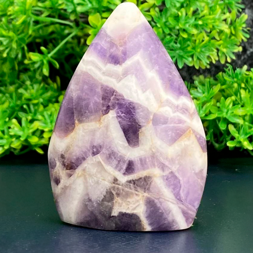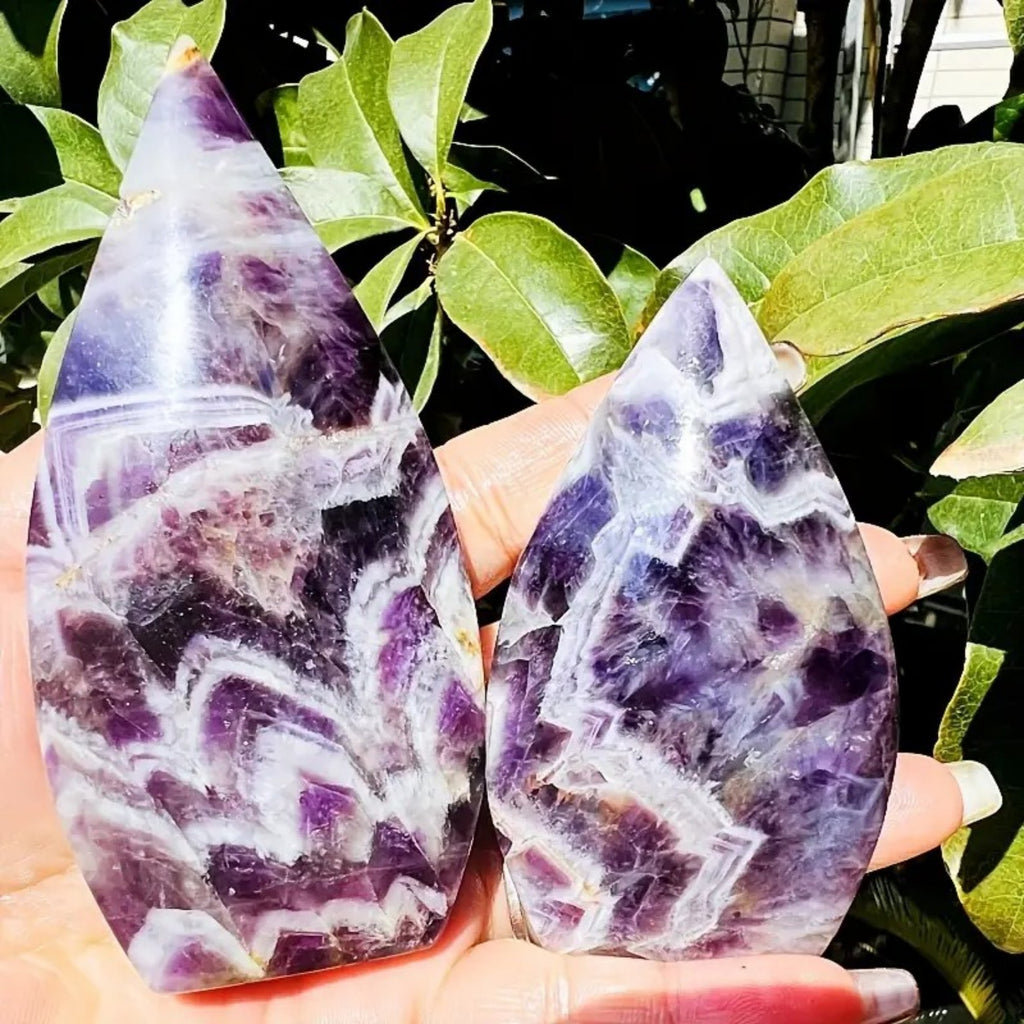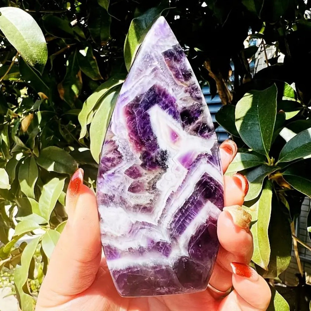 Esta piedra preciosa, con su distintiva forma de antorcha, no solo añade un toque de belleza natural a tu espacio, sino que también trae consigo los beneficios calmantes y protectores de la amatista.