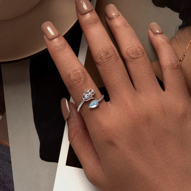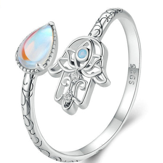 Anillo de plata 925 ajustable, con un diseño delicado y lleno de significado. En uno de sus extremos lleva una pequeña lágrima de piedra lunar, y en el otro, una Mano de Fátima con un ópalo artificial al centro y dos mini circonitas que aportan un brillo sutil.
