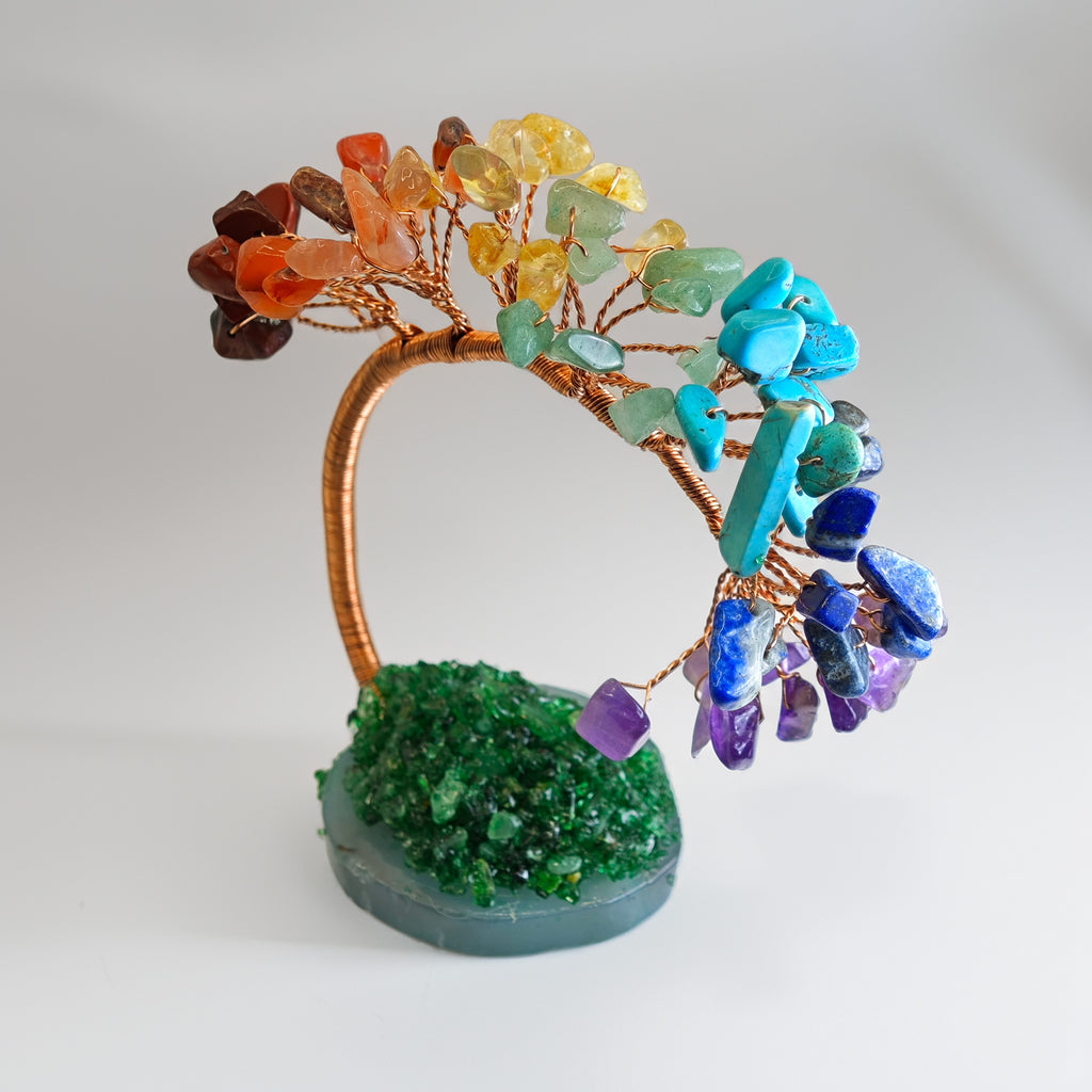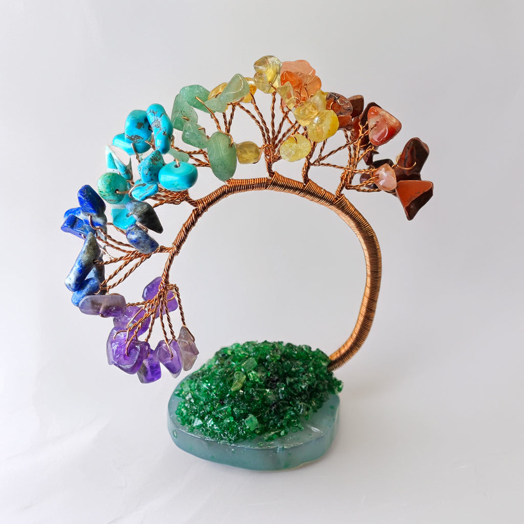 Este es un árbol decorativo artesanal hecho a mano con alambre de cobre y pequeñas piedras naturales de colores. Su diseño curvo y base de resina verde le da un toque natural y armónico, ideal para colocar sobre escritorios, repisas o mesas auxiliares como elemento decorativo. Cada piedra representa un color distinto, lo que aporta un sutil equilibriovisual.