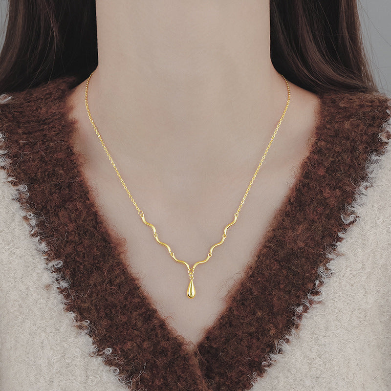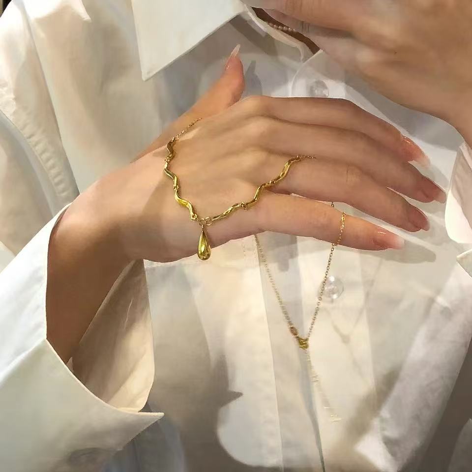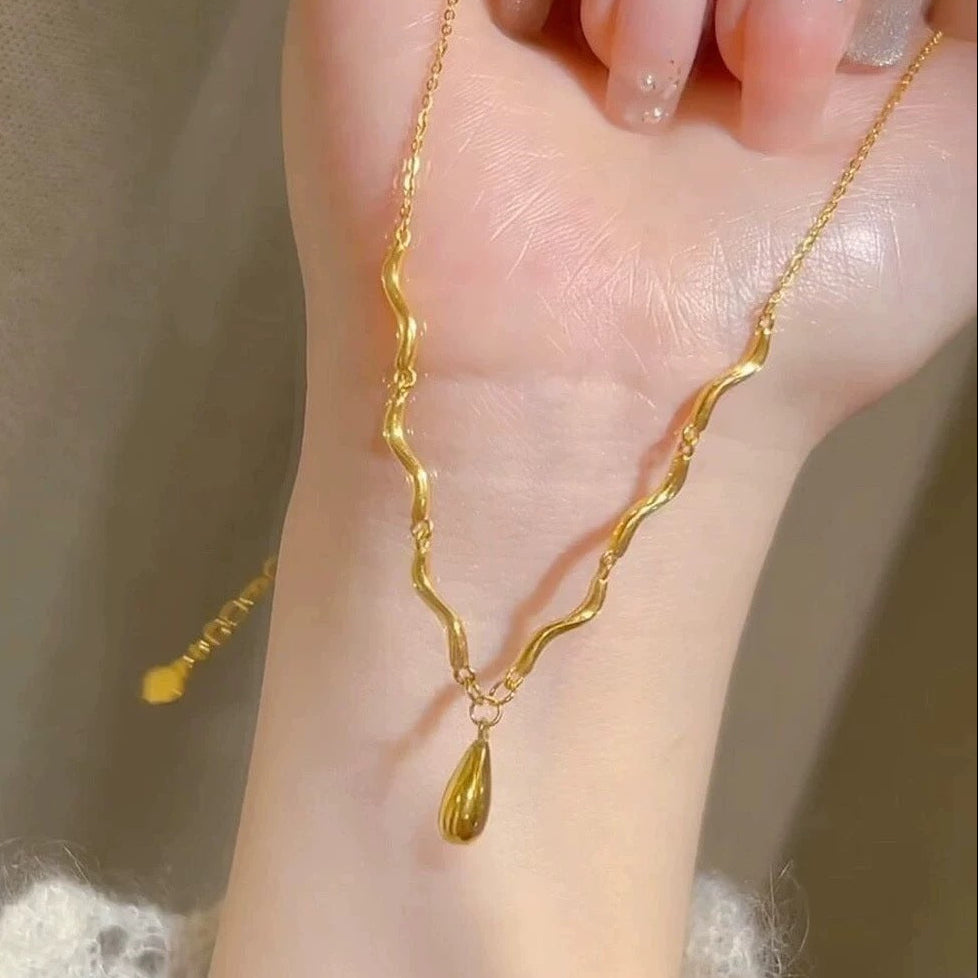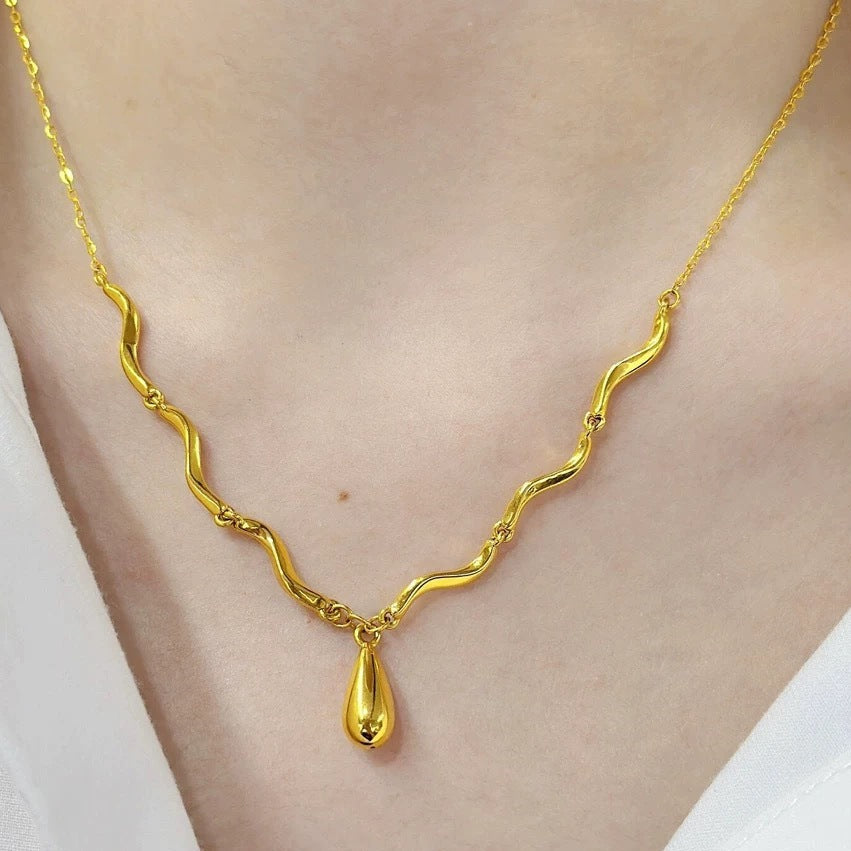 Un diseño moderno y delicado que resalta por su originalidad. Este collar cuenta con una cadena dorada que sostiene un dije en forma de gota, acompañado de un patrón ondulado en la parte frontal que aporta un toque sofisticado y artístico. Su acabado brillante lo convierte en una pieza versátil, perfecta para elevar un look casual o complementar un outfit elegante.