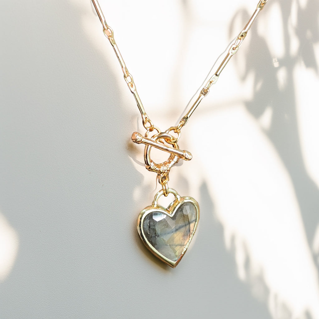 Collar dorado con diseño de cadena de eslabones finos y cierre tipo aro con barra. El protagonista es un colgante en forma de corazón elaborado en piedra labradorita, que revela destellos azules y grises al reflejar la luz. Una pieza que combina elegancia y energía natural, ideal para quienes buscan un accesorio con estilo sofisticado y un toque místico protector.