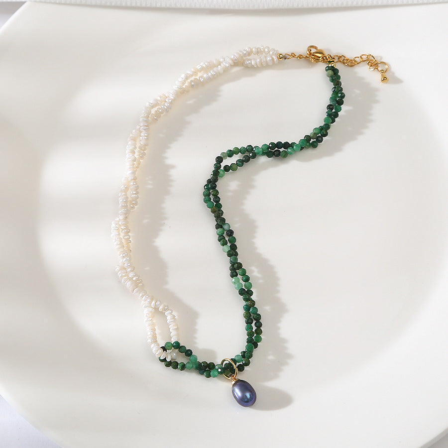 Este collar destaca por su diseño único y moderno que combina dos estilos en una sola pieza. Por un lado, presenta delicadas cuentas blancas, y por el otro, un elegante hilo de piedras verdes facetadas que aportan frescura y sofisticación. En el centro, un colgante en forma de gota con acabado nacarado en tono oscuro añade un contraste llamativo y lleno de carácter. Su cierre ajustable en dorado asegura un calce cómodo y versátil, perfecto para elevar tanto un look casual como uno más elegante.
