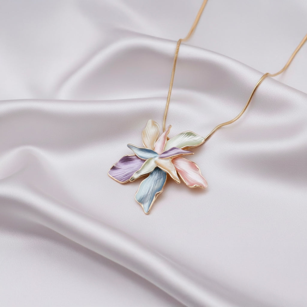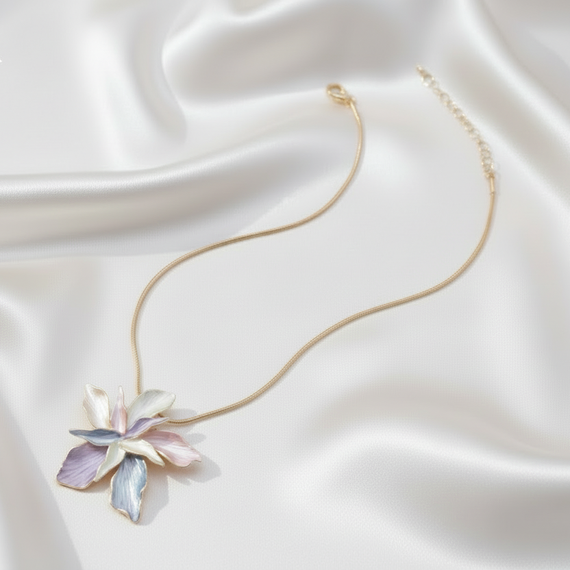 Esta pieza es una oda a la naturaleza efímera, presentando un dije central que captura la delicadeza de una flor en plena apertura. Cada pétalo ha sido trabajado con un degradado de esmaltes en tonos pastel —lavanda, rosa suave, azul cielo y crema— que parecen cobrar vida gracias a sus sutiles relieves y bordes dorados. Es un accesorio que fusiona la artesanía clásica de la pintura sobre metal con una estética romántica y etérea, ideal para quienes buscan una joya que transmita frescura y originalidad artística. Propiedades: Acabado en aleación ecológica con técnica de esmaltado al óleo, garantizando colores vibrantes y duraderos. Diseño: Motivo floral asimétrico con pétalos texturizados y cadena de eslabones finos ajustable. Estética: Estilo "Jardín Bohemio" que destaca por su armonía cromática y su diseño orgánico inspirado en la botánica.