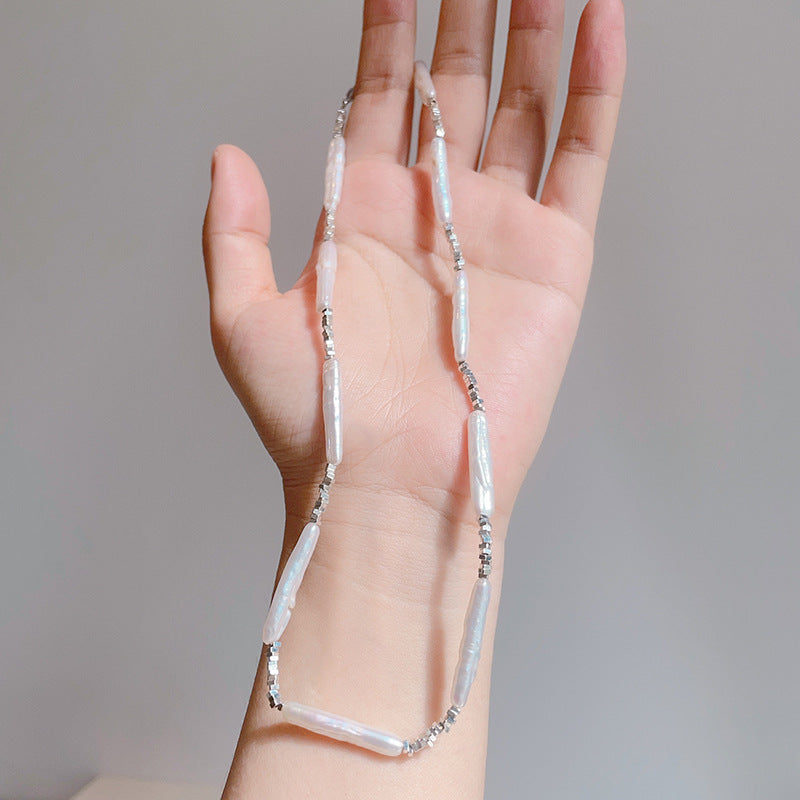 El Collar Horizonte Perlado es una pieza de diseño sutil y refinado, donde pequeñas cuentas de plata de forma irregular se entrelazan con perlas alargadas, creando un ritmo visual orgánico y elegante.