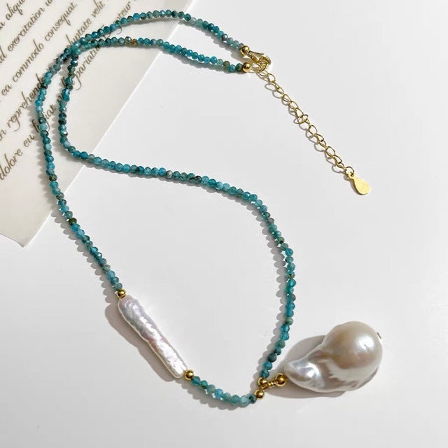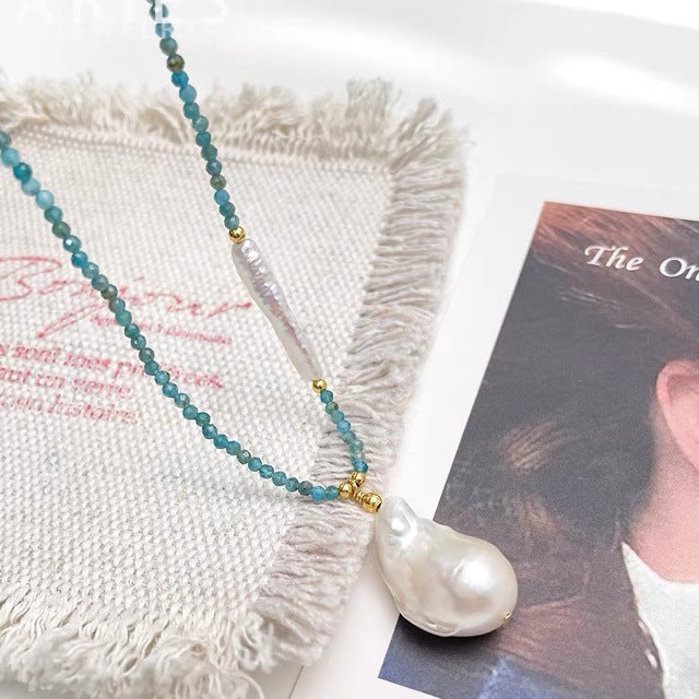 Las pequeñas cuentas facetadas de apatita reflejan matices del océano en movimiento, mientras que la perla barroca central aporta un toque único y natural. Un delicado detalle de perla alargada lateral equilibra el diseño con sutileza.
