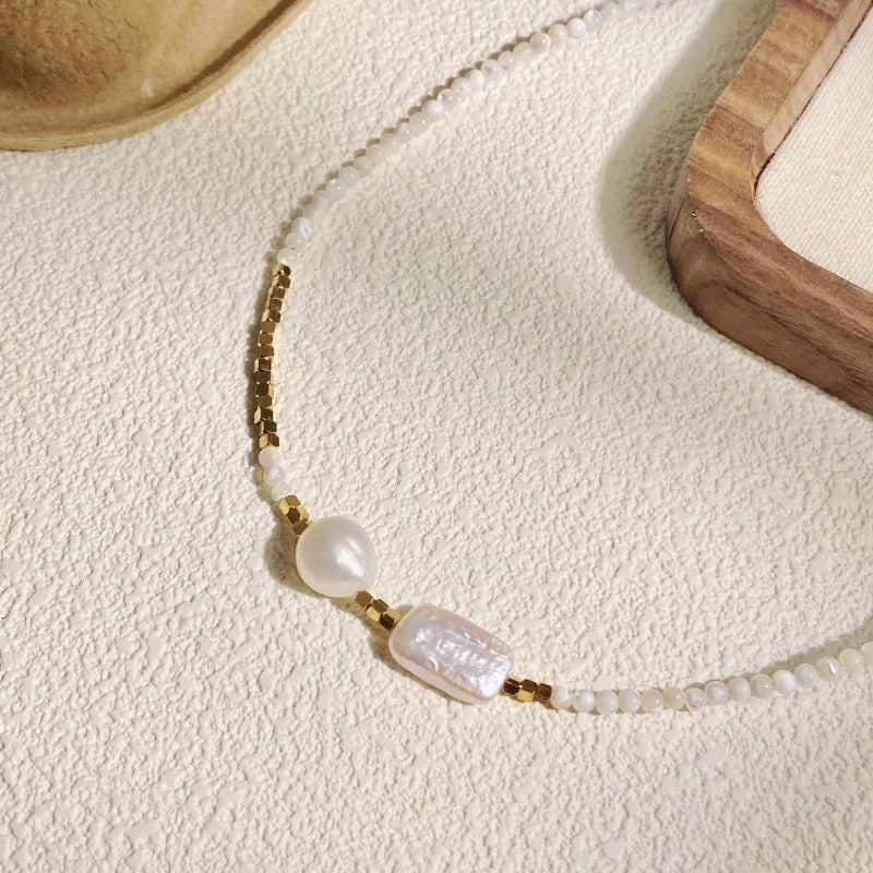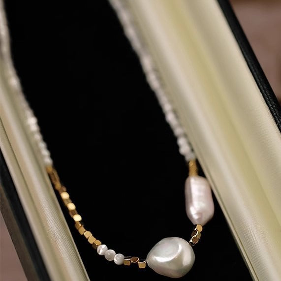 Este collar es una celebración de la elegancia natural y los detalles que marcan la diferencia. Está compuesto por delicadas mostacillas de nácar que envuelven el cuello con un brillo suave y sutil, creando una base luminosa y armoniosa. Al centro destacan dos perlas barrocas de mayor tamaño, únicas en forma y textura, que aportan carácter y autenticidad a la pieza.