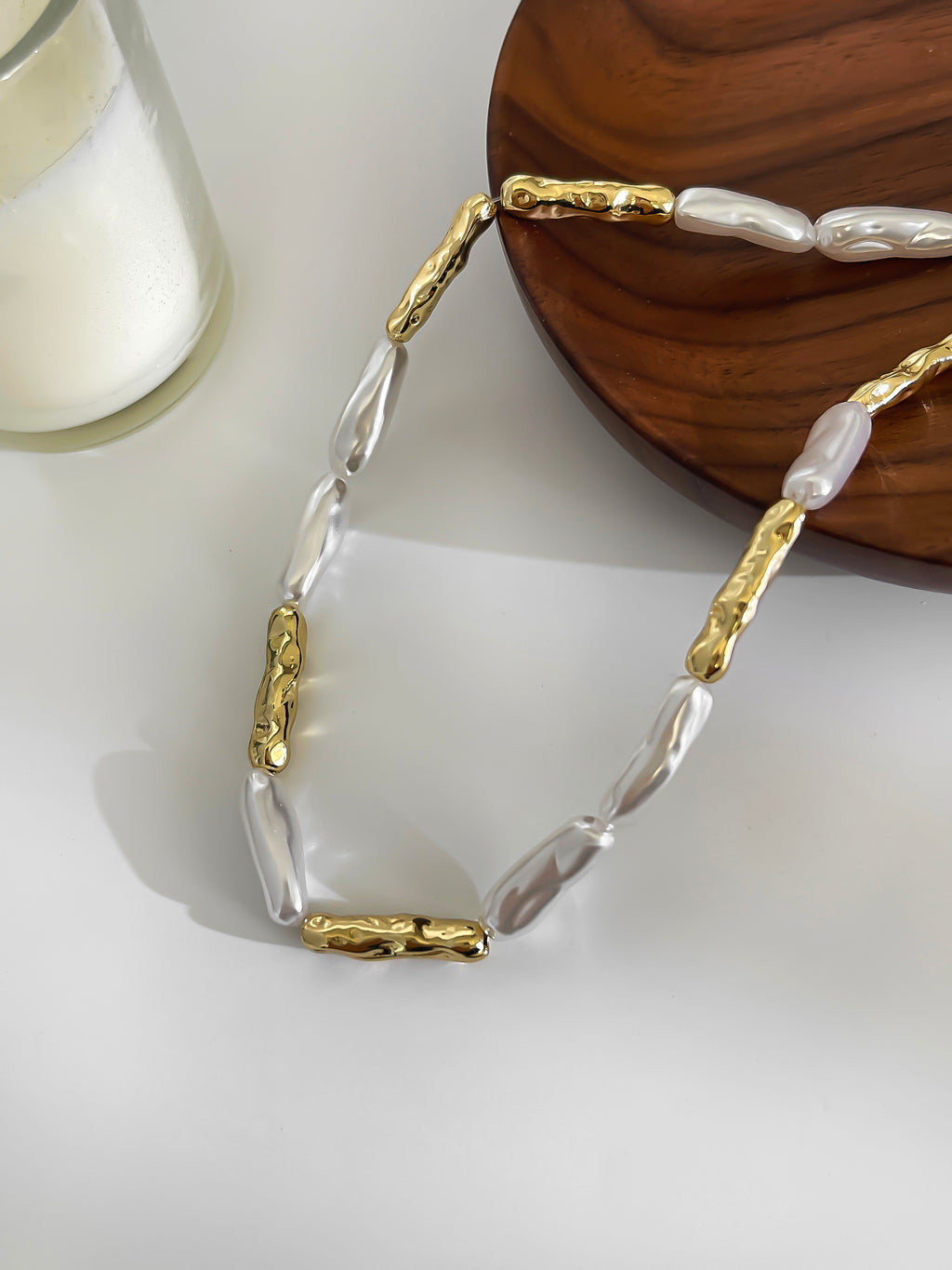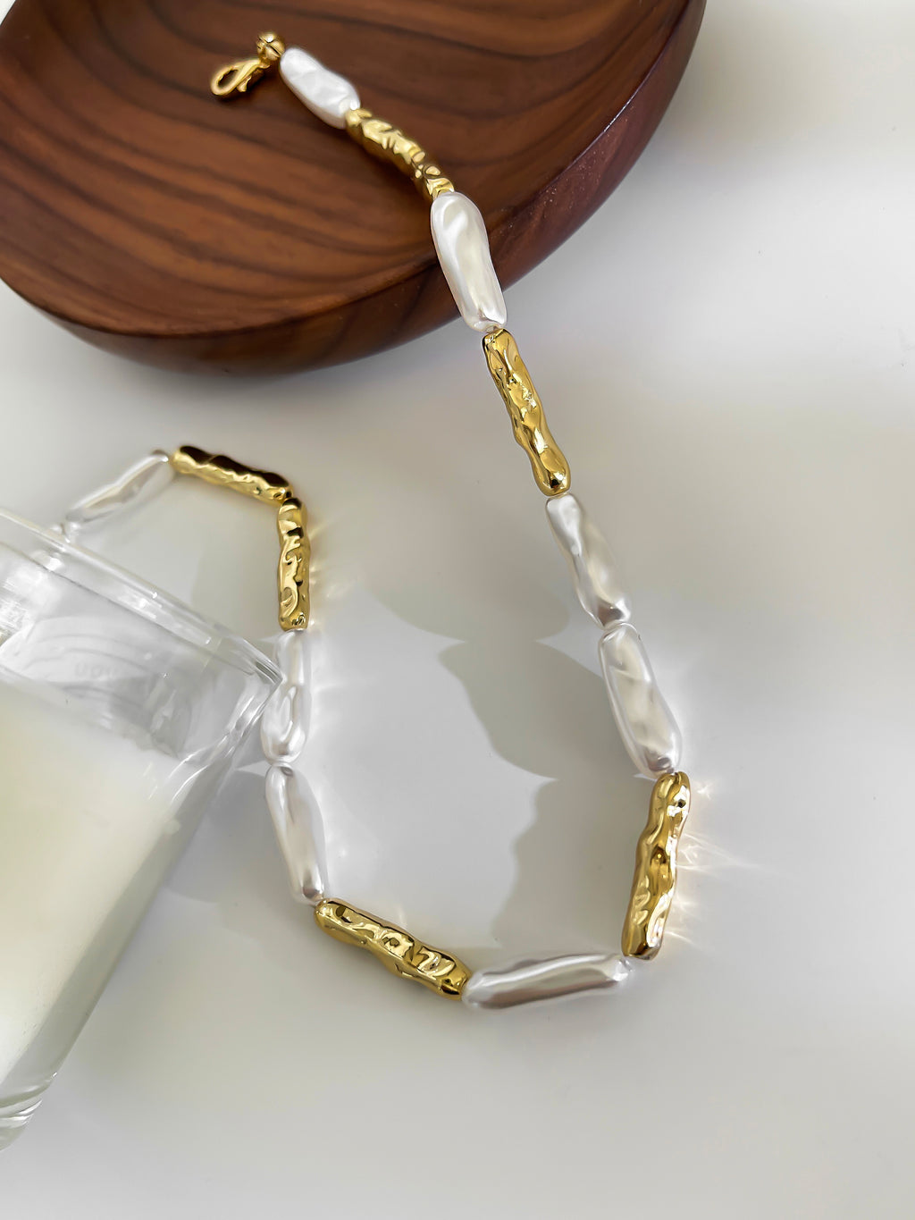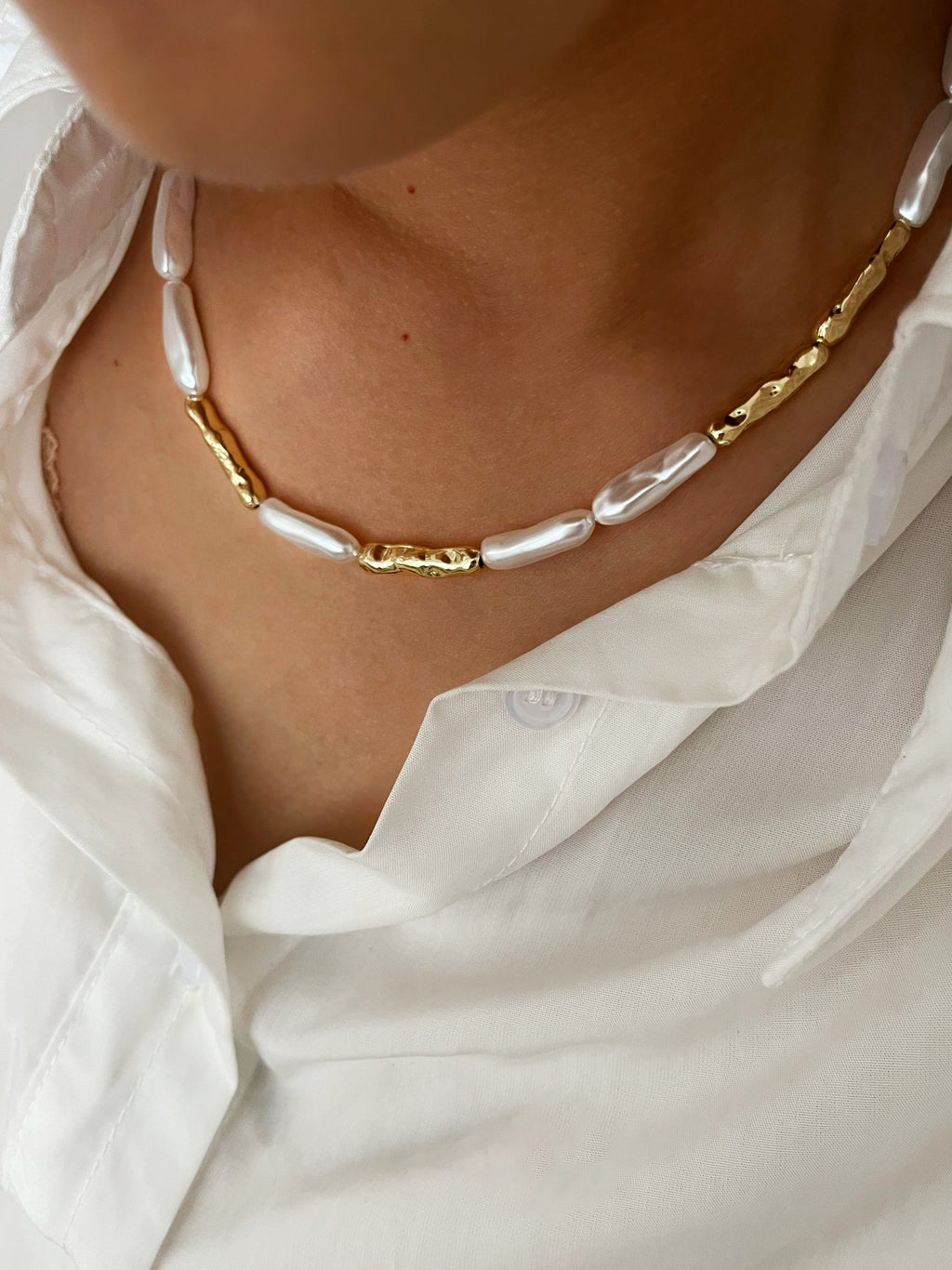 Este collar combina perlas de imitación alargadas con eslabones dorados de diseño irregular, creando un contraste equilibrado entre textura y color. Su estructura ligera lo hace cómodo de llevar, mientras que su estilo sencillo y elegante lo convierte en un complemento versátil para distintas ocasiones.