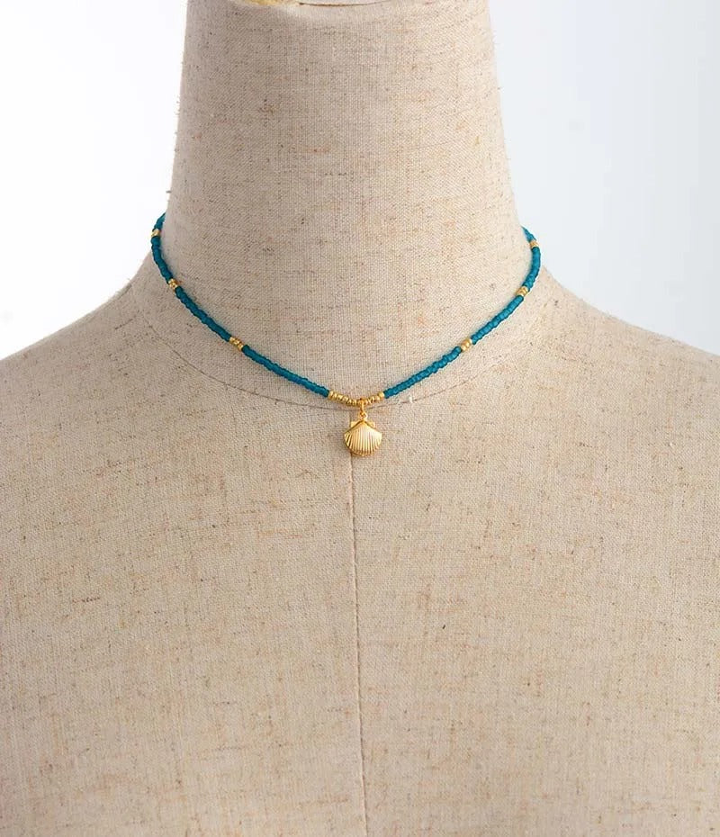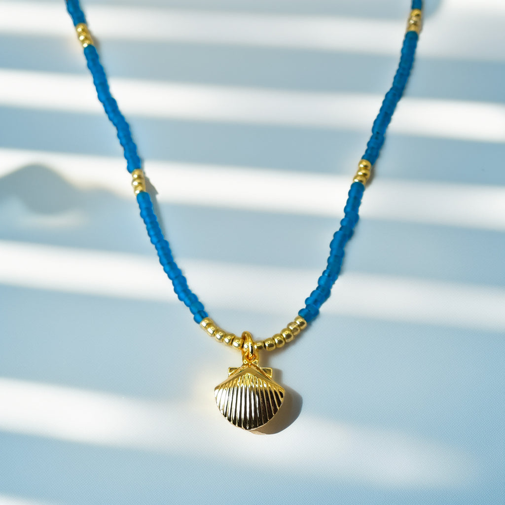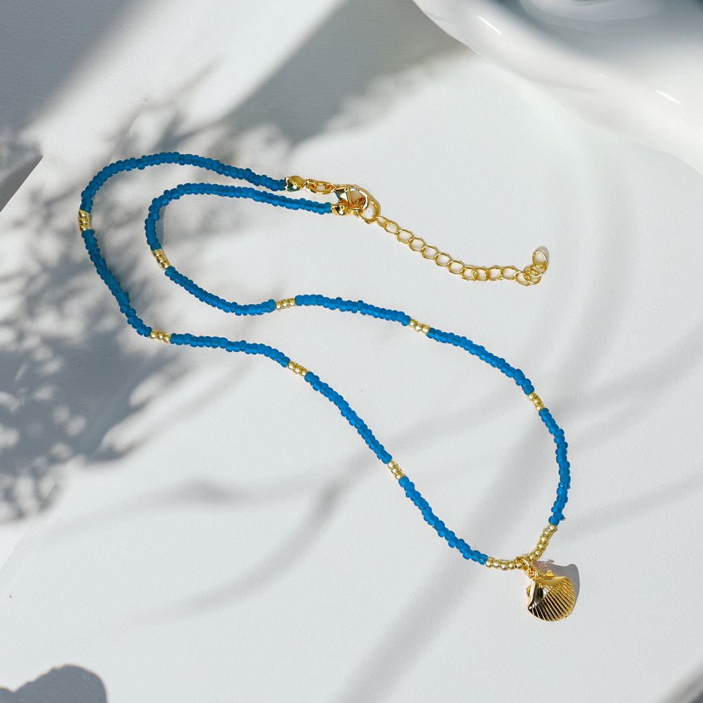 La Gargantilla Alma Marina es una joya ligera y delicada que te conecta con la calma del océano y el espíritu libre del verano. Hecha con pequeñas cuentas en tono turquesa y detalles dorados, su diseño está coronado por una concha dorada, símbolo de protección, intuición y belleza natural.