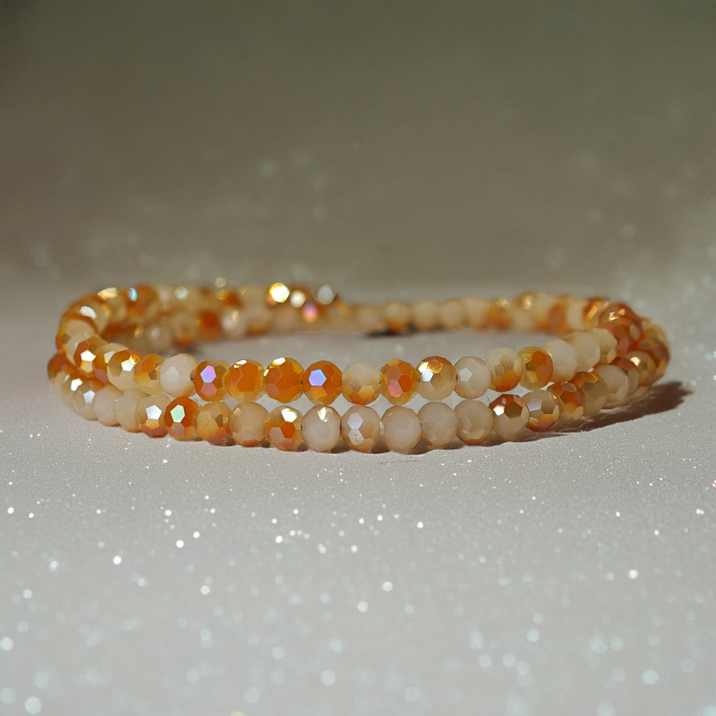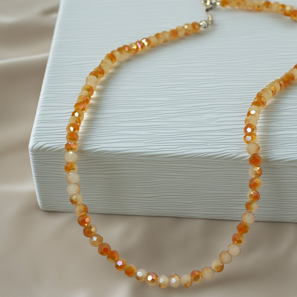 Esta gargantilla está elaborada con cuentas facetadas en tonos miel, caramelo y suaves reflejos dorados. Su brillo sutil recuerda la calidez del sol al amanecer, aportando un toque delicado y luminoso al cuello. Es una pieza liviana, versátil y fácil de combinar, ideal para quienes buscan accesorios que transmitan calma y cercanía.
