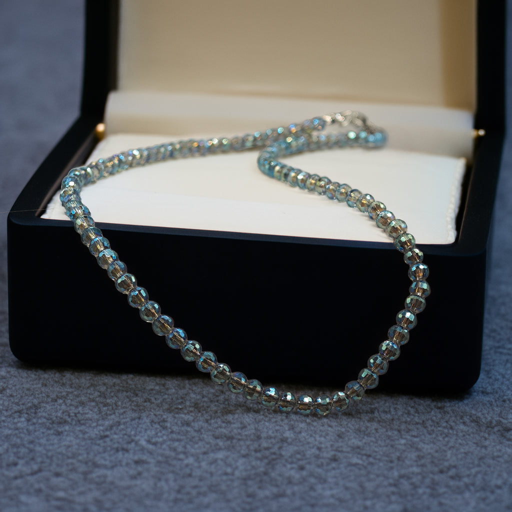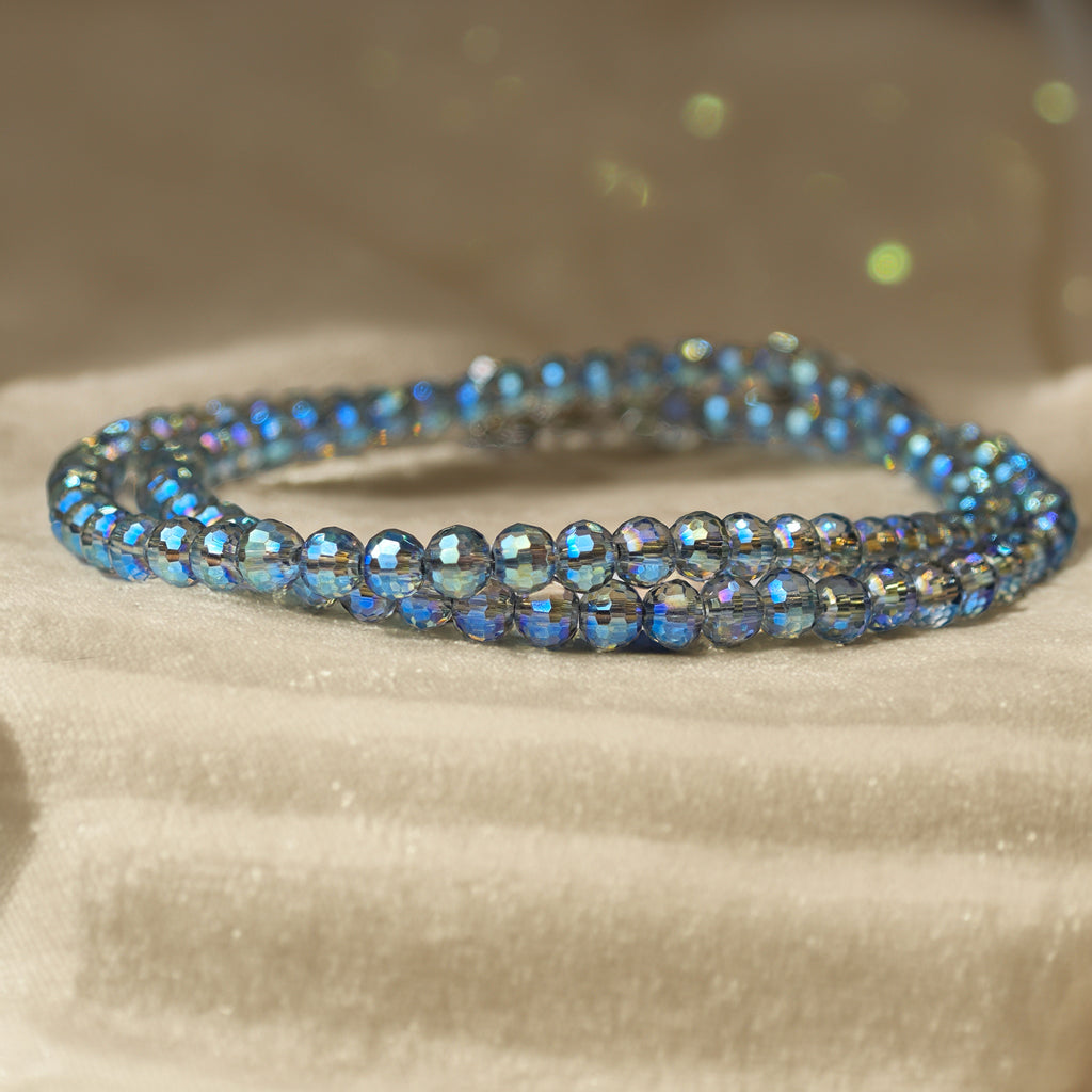 Este collar está compuesto por delicadas cuentas facetadas de cristal en tonos azul iridiscente, que reflejan la luz con un efecto tornasolado único. Su diseño minimalista realza el cuello con un toque luminoso, sin recargar. Ideal para complementar un look elegante o para dar un detalle especial a un atuendo sencillo.