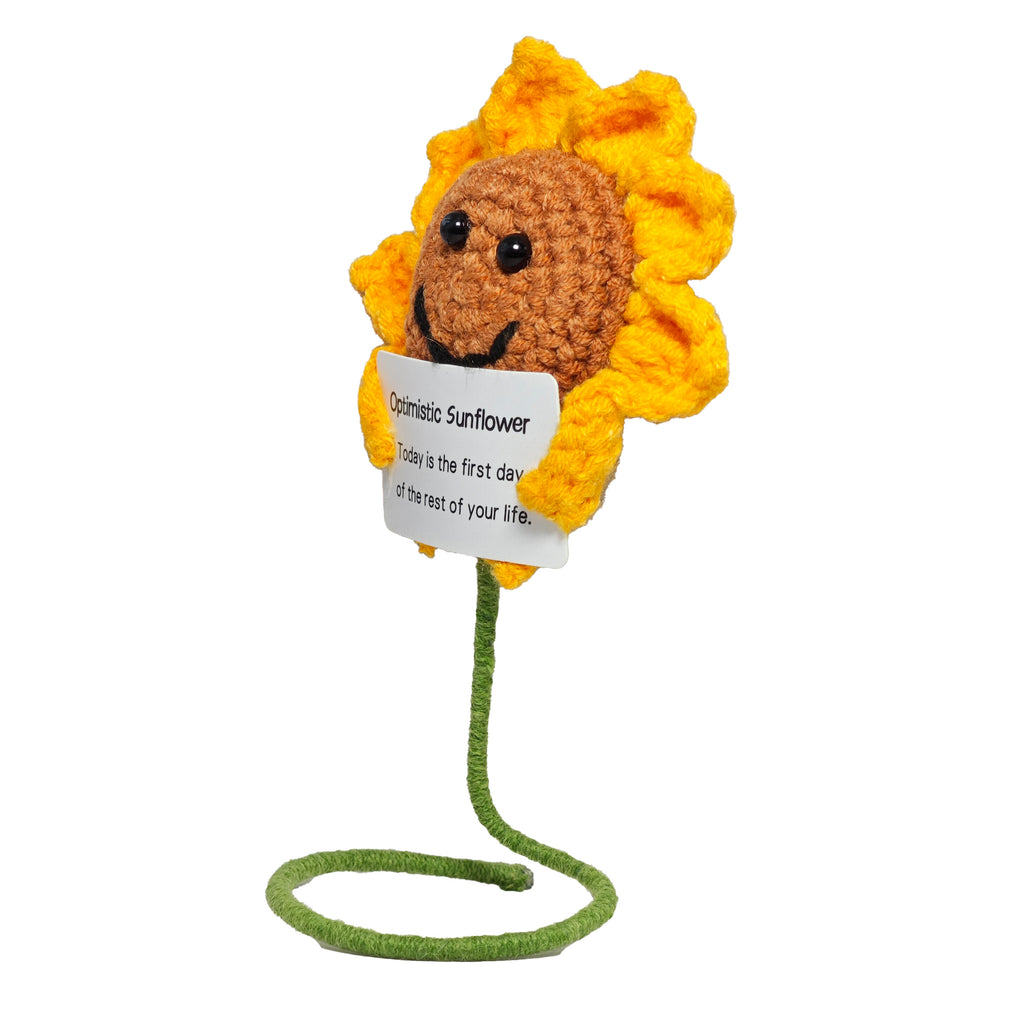 Peluche tejido a mano, el regalo perfecto o para decorar tu espacio. Este encantador Girasol positivo lleva consigo un mensaje positivo para alegrarle el día a cualquier persona.