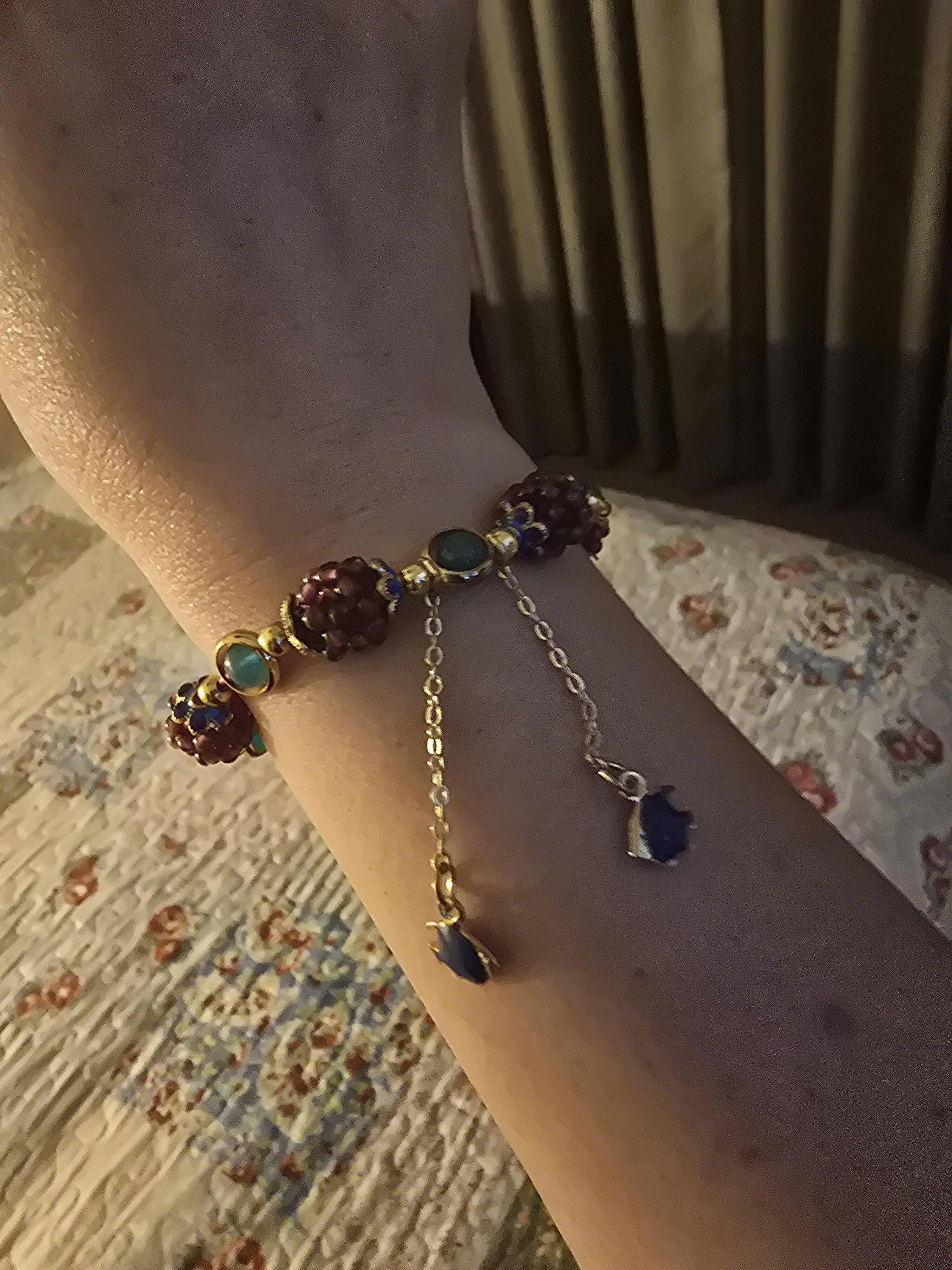 Una pulsera con un diseño equilibrado y armonioso. Su tono granate, combinado con detalles azul verdoso y dorado, crea un contraste sutil y elegante. Hecha con materiales cuidadosamente seleccionados, es un accesorio versátil que complementa distintos estilos.