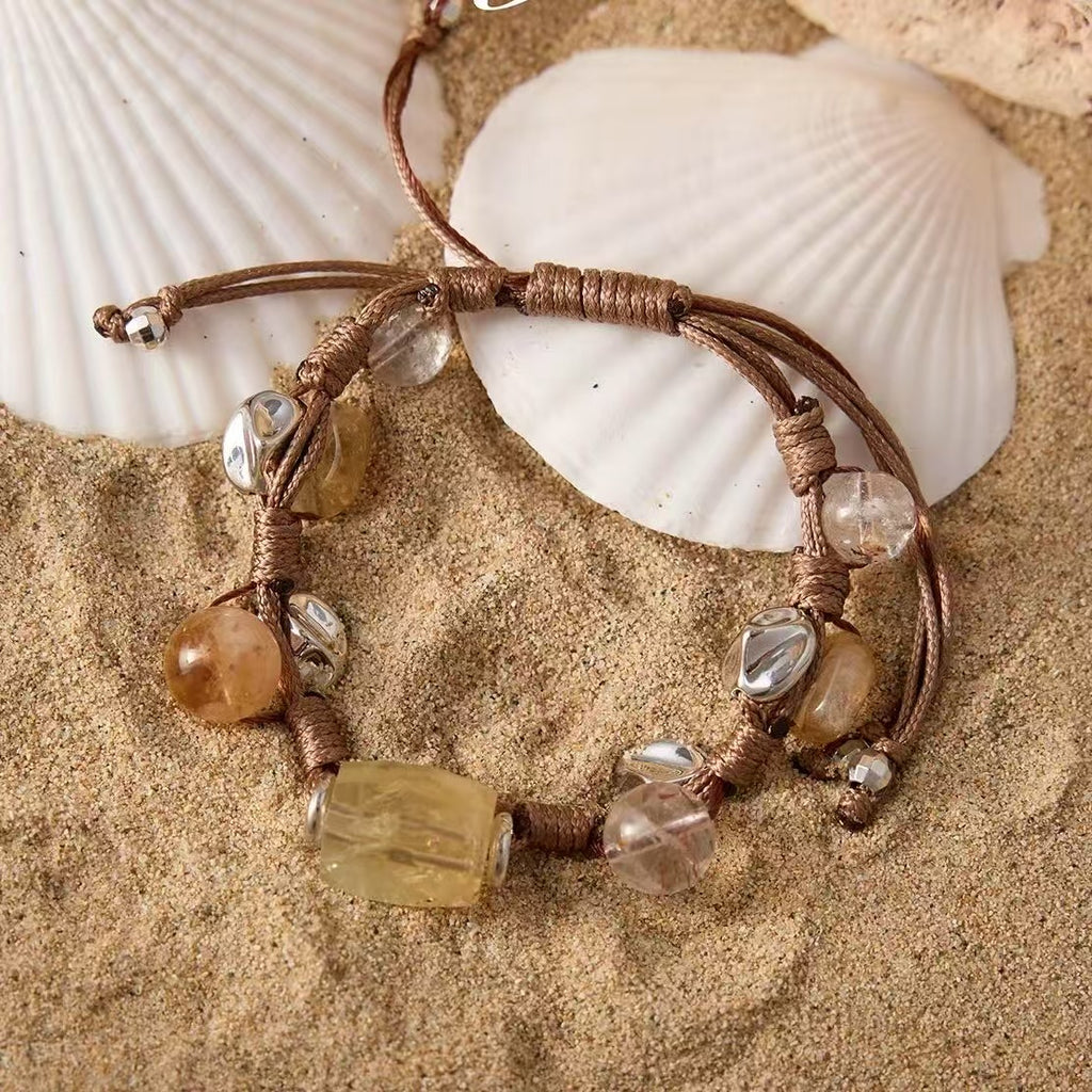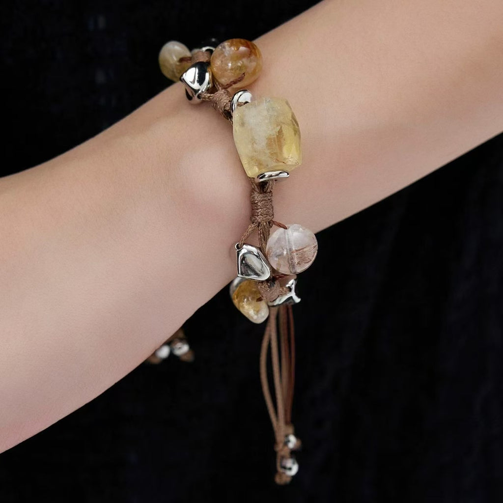 Esta pulsera, conocida como Amuleto de la Riqueza, está elaborada con piedras naturales de citrino en diferentes formas, combinadas con delicados detalles metálicos y cordón ajustable en tono tierra que realza su estilo artesanal y elegante.