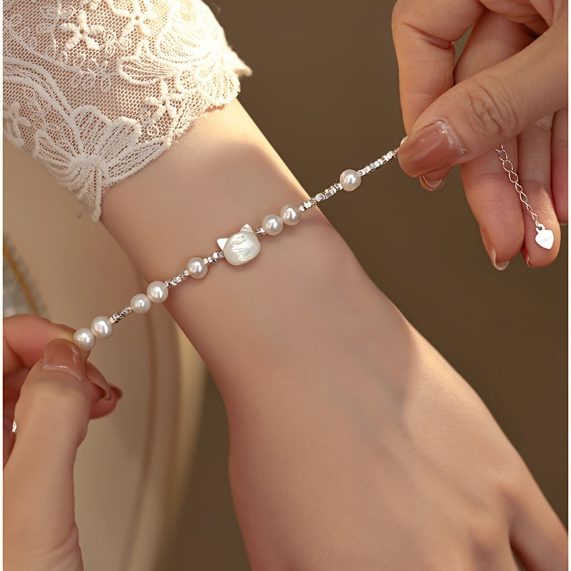 Una joyita pensada para quienes aman los detalles dulces y refinados. Nuestra Pulsera Gatito Blanco combina mostacillas cuadradas irregulares de plata con perlas (sintéticas), creando una pieza armoniosa y femenina.