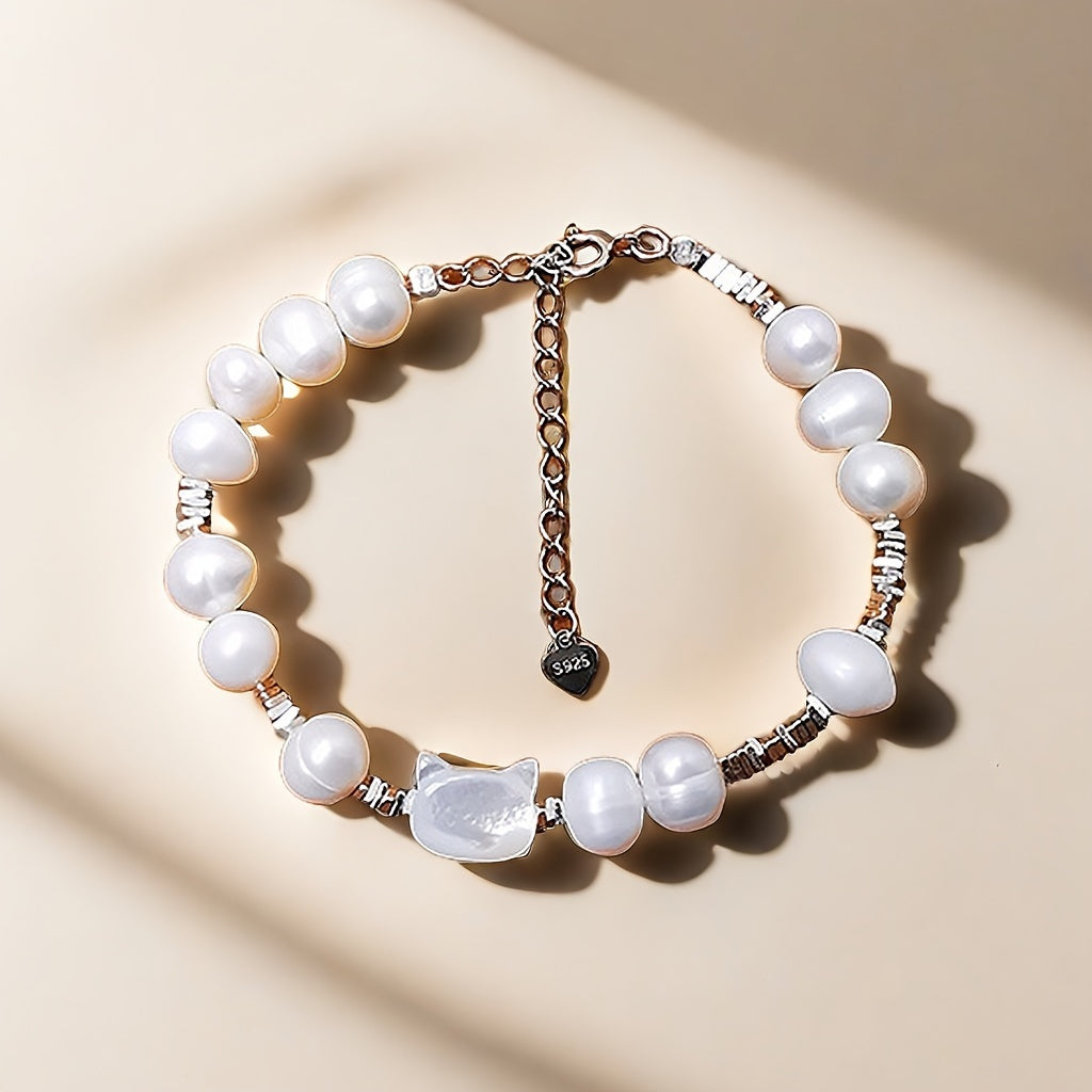 En el centro, una adorable carita de gato blanco se roba todas las miradas, aportando un toque tierno y juguetón que equilibra con elegancia el brillo sutil del resto de la pulsera.