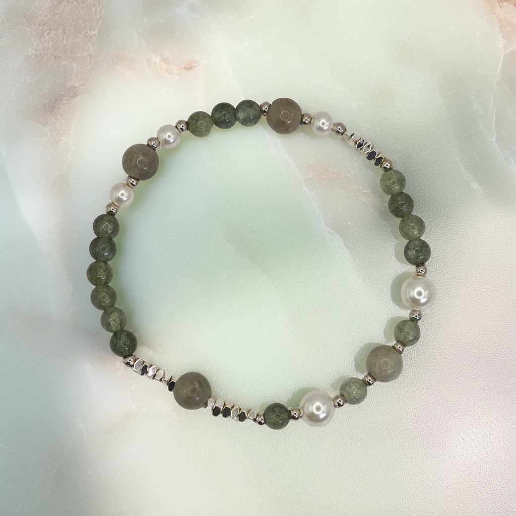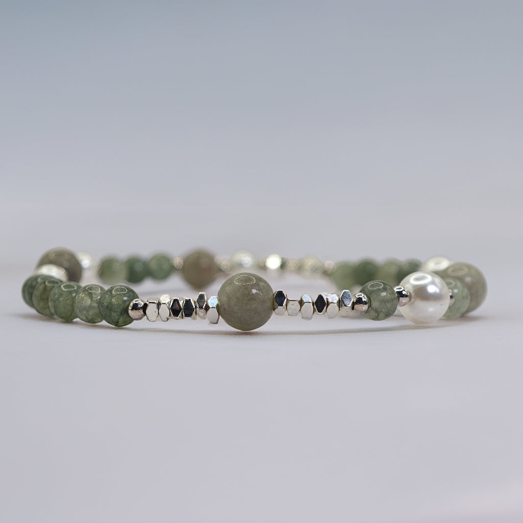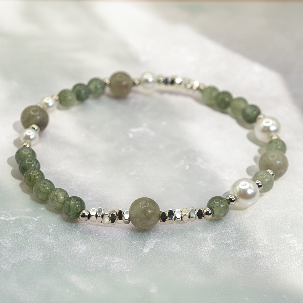 Esta pulsera está elaborada con cuentas de jade en tonos verdes, combinadas con perlas blancas y pequeños detalles en plata. El jade es reconocido como una piedra asociada a la calma y la armonía, mientras que las perlas aportan un toque clásico y natural. Su diseño sencillo y equilibrado la convierte en una pieza versátil, fácil de llevar en el día a día o en ocasiones especiales.