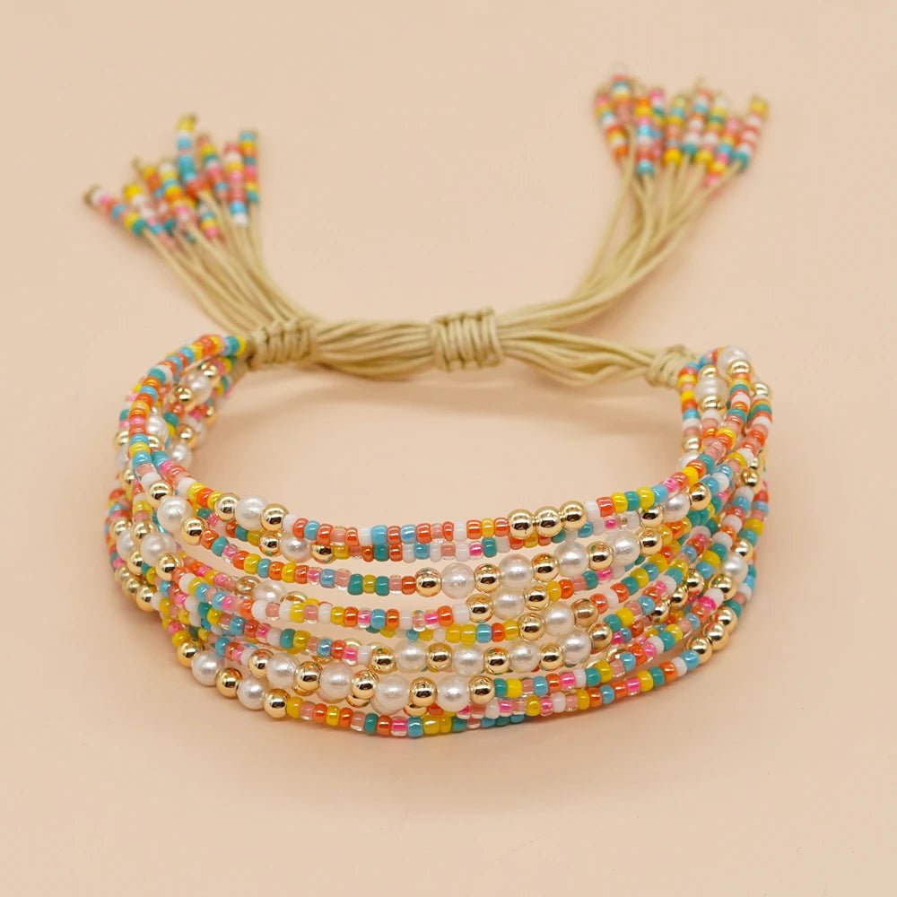Confeccionada con múltiples tiras de mostacillas en tonos suaves y pasteles, esta pulsera ofrece un toque de color sutil y elegante.