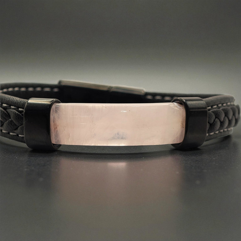 Una pieza que equilibra lo moderno con lo natural. Esta pulsera combina un tubo central de cuarzo rosado pulido con un diseño de cuero negro trenzado y liso, resaltado con detalles metálicos en tono oscuro. Su estilo firme y contemporáneo la convierte en un accesorio versátil, perfecto para quienes desean llevar consigo la suavidad del cuarzo en un formato masculino y sofisticado.