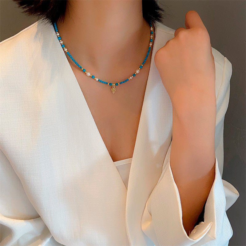 En el plano espiritual, el turquesa es considerado un protector de energías y un potenciador de la comunicación, mientras que la perla evoca pureza y serenidad. Este collar no solo resalta tu look, también conecta con un aire zen y equilibrado.