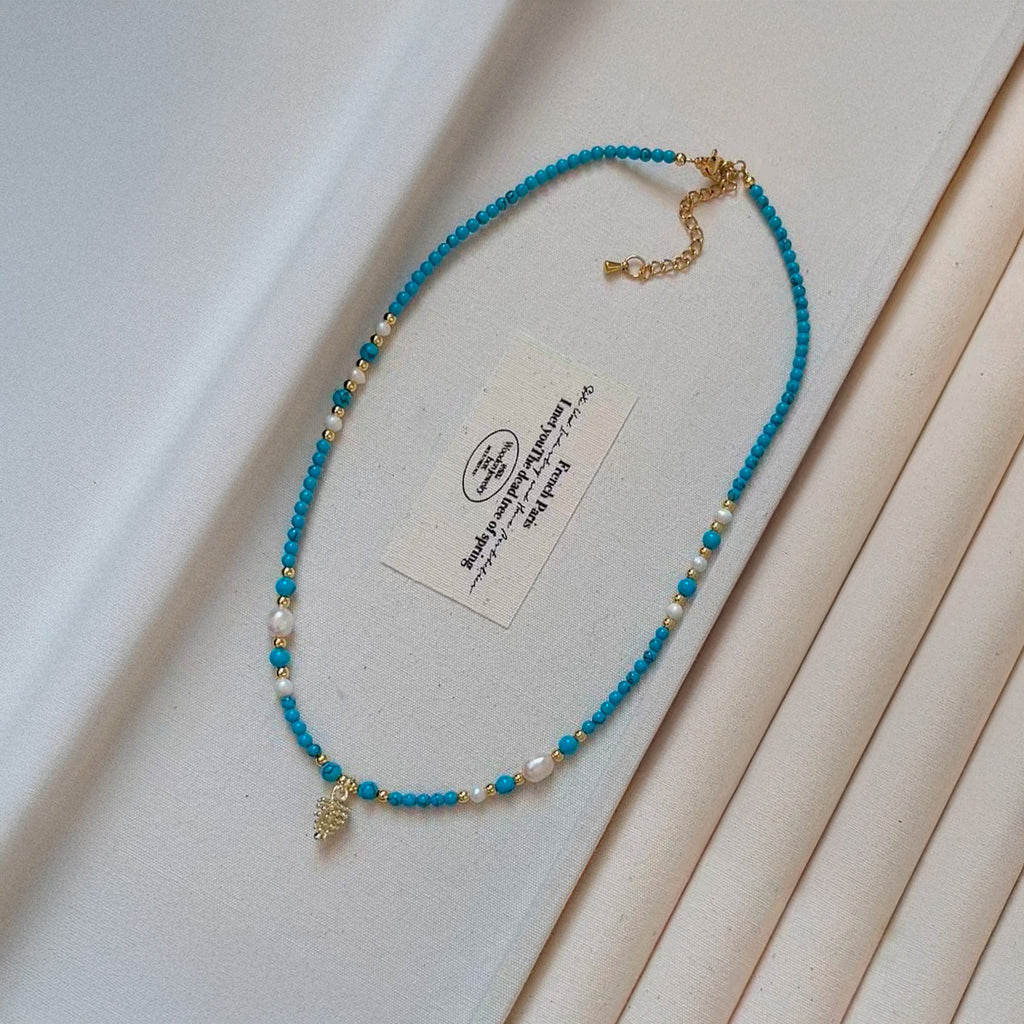 Collar de cuentas en tonos turquesa y perla, un diseño delicado que combina frescura y elegancia. En el centro destaca un dije dorado con forma de Piñón, símbolo de naturaleza y renovación. Su estilo ligero lo convierte en un accesorio versátil, ideal para acompañar tanto atuendos casuales como formales.