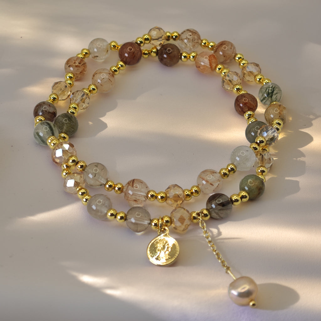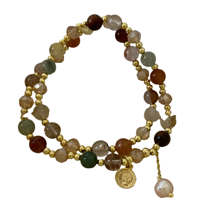 Pulsera sofisticada y versátil, elaborada con cuentas de cristal en tonos cálidos y terrosos que se combinan con esferas doradas para aportar un brillo elegante. Su diseño incluye un delicado dije de moneda dorada y un colgante de perla de imitación, que añade un toque clásico y femenino. Ideal para usar en capas o como pieza protagonista, esta pulsera realza cualquier look con un equilibrio perfecto entre color, luz y distinción.