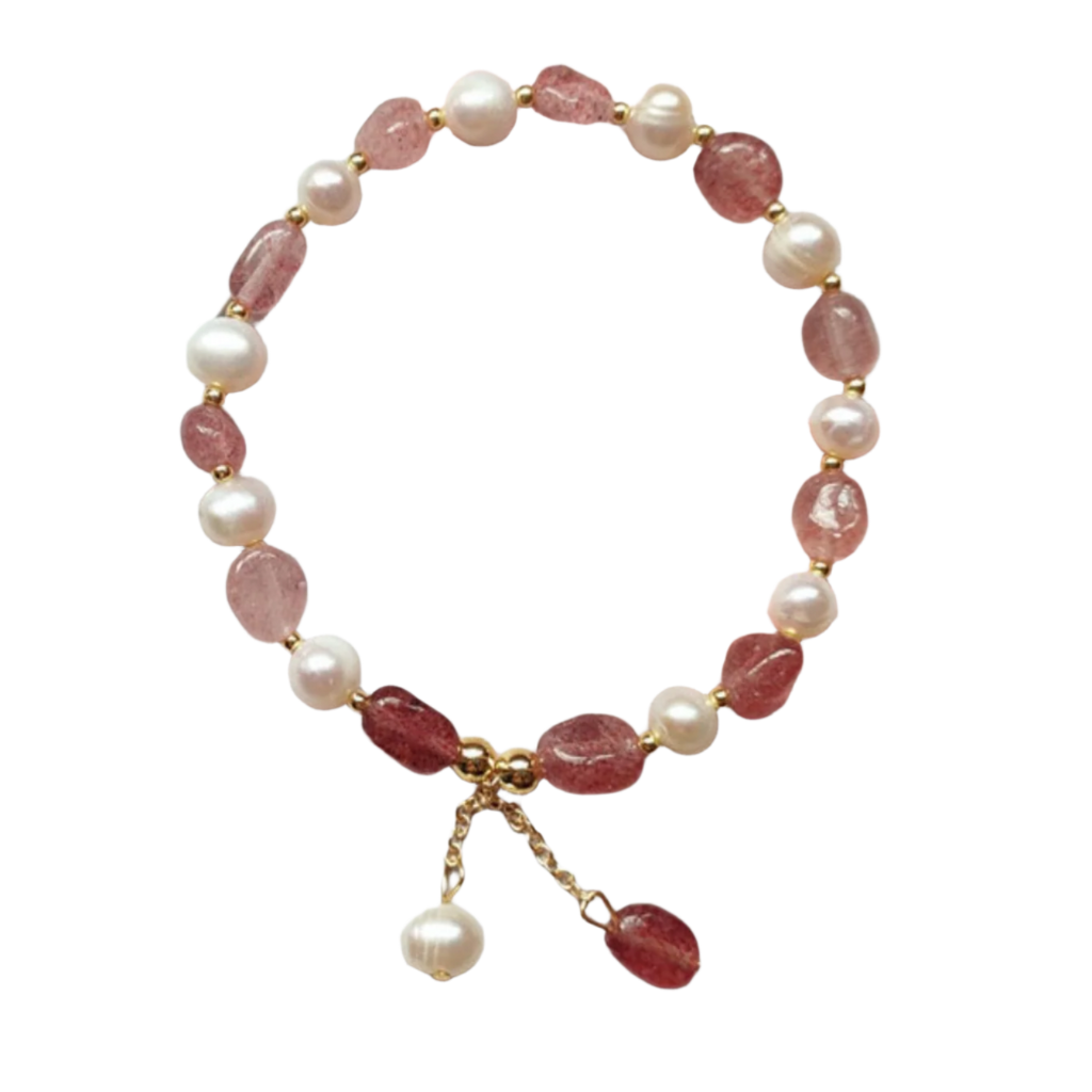 Pulsera delicada y elegante elaborada con cuentas de cristal en suaves tonalidades rosadas, combinadas con perlas de río que aportan un toque clásico y atemporal. Detalles en pequeñas cuentas doradas realzan el brillo y la armonía del diseño. Su cierre ajustable con colgantes de perla y cristal añade movimiento y sofisticación, convirtiéndola en el accesorio perfecto para realzar cualquier look con un aire femenino y refinado.