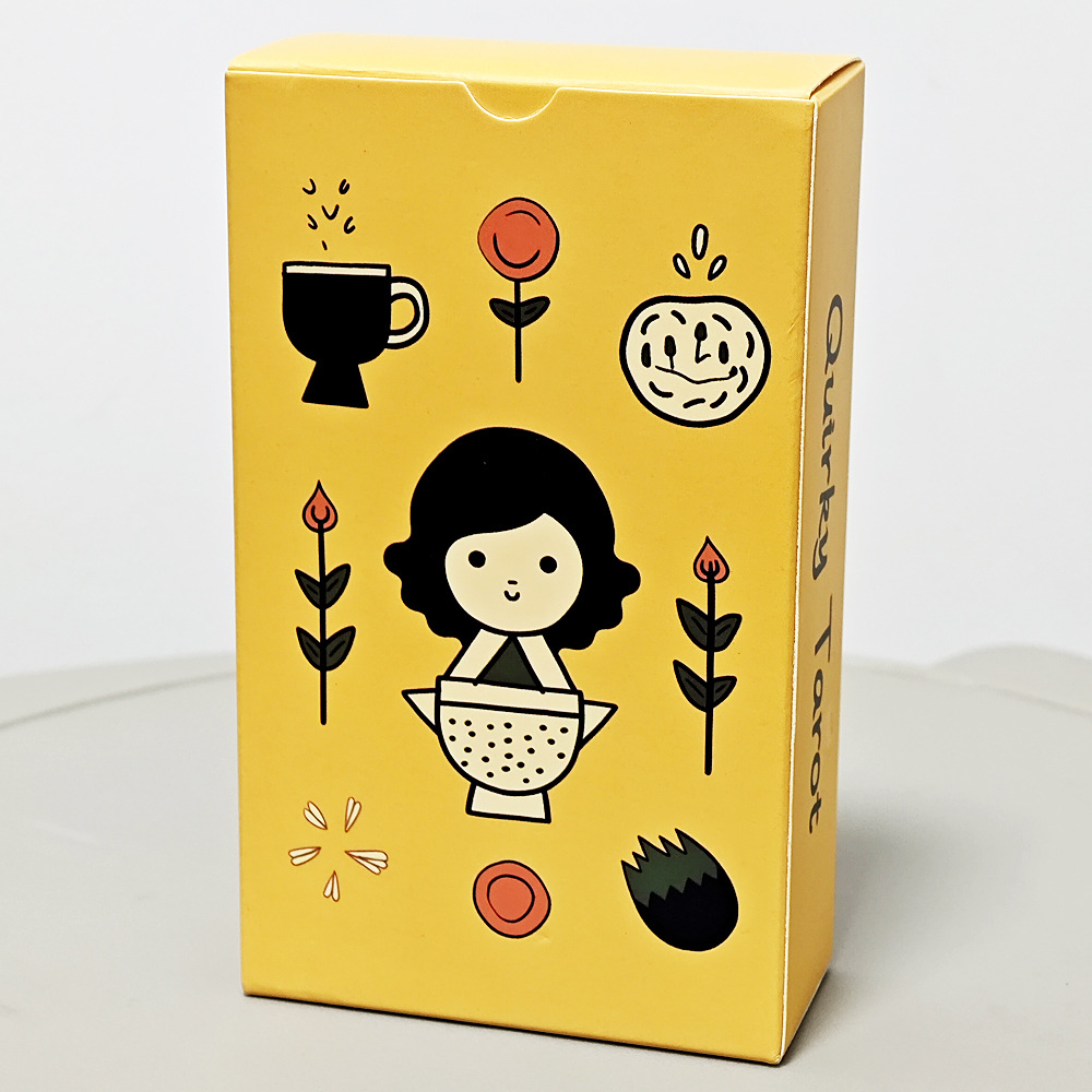 Caja de tarot ilustrada con diseño colorido y estilo minimalista. Sobre fondo amarillo se presentan dibujos simpáticos como una taza, flores, un sol sonriente y una figura femenina en el centro. Su estética alegre y moderna hace que este mazo sea ideal para quienes buscan un tarot diferente, creativo y lleno de encanto visual.