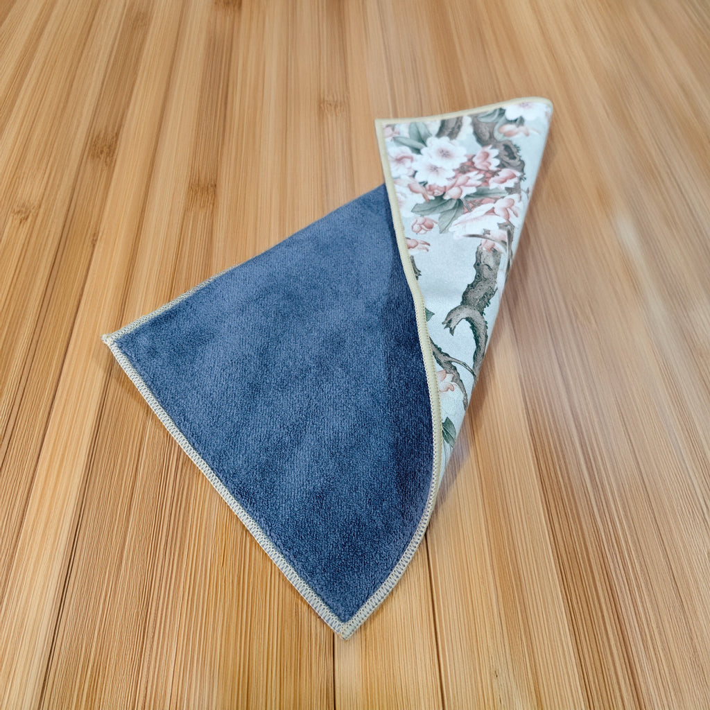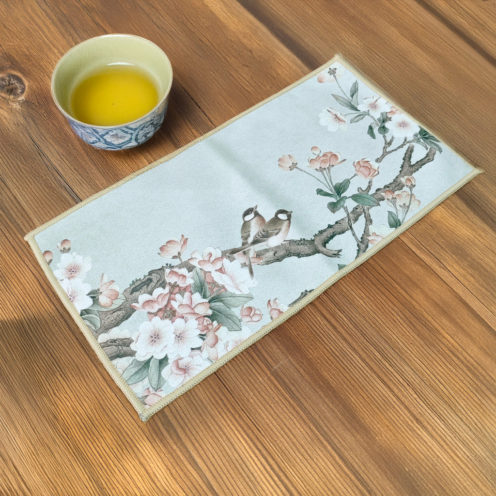 La toalla de té gruesa que ves en la imagen es un accesorio tradicional chino utilizado durante las ceremonias del té, una práctica que busca crear un ambiente tranquilo y respetuoso en torno al acto de servir y compartir el té. Está diseñada para colocarse sobre la mesa, sirviendo como una superficie absorbente donde se pueden apoyar las tazas y las teteras. Además de ser funcional, también aporta una estética elegante y natural, como se puede ver en el diseño de pájaros y flores.